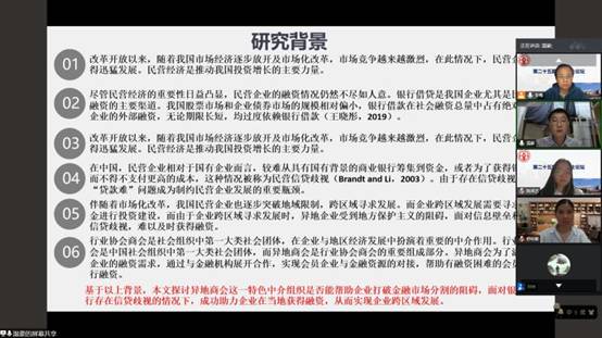 吴蝶同学报告的论文题目为《金融科技的应用对商业银行的绩效影响》,该文深剖了金融科技的发展应用对商业银行的影响;点评老师建议该同学注意表达方式要切题、改正创导机制的逻辑、并注意解决实证研究中的内生性问题。王利彩同学的报告题目是《我国融资融券制度与股价崩盘风险研究》,该文研究了我国的融资融券制度和股价之间的关系,与会的老师建议该同学写文章时注意介绍我国融资融券制度的背景内容现状,做研究时要使用最新的数据和参考最近的研究,并注意突出自己的创新点。温豪同学报告的题目是《信贷歧视、异地商会与企业融资》,该文研究异地商会和企业的债务融资,点评老师建议该同学可去掉信贷歧视,仅选择民营企业作为研究样本,并聚焦于企业债务融资,同时考虑债务规模、债务期限与债务成本三个方面,还可通过中介效应或交乘项检验异地商会对企业债务融资的影响机制。老师们充分的准备、认真细致的点评让同学们获益良多。