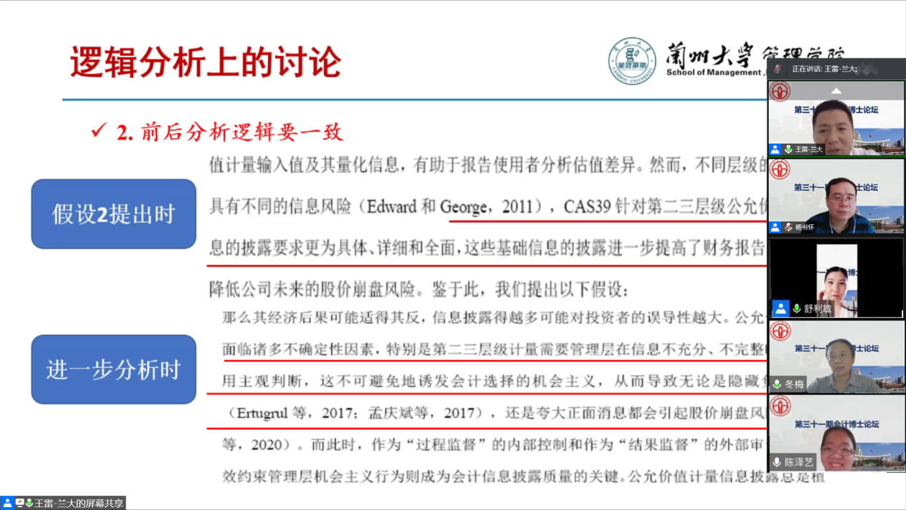 7月5日上午9:00-11:00,DB真人旗舰与科研处联合举办的第三十一期会计博士论坛在腾讯会议线上召开。此次论坛主题是杨书怀教授报告其工作论文:公允价值分层计量降低了股价崩盘风险吗?——基于内外部监督的调节效应检验。论坛邀请了兰州大学管理公司会计系主任,会计学术联盟联合发起人王雷博士对杨教授的论文进行点评。DB真人旗舰经理文芳教授、副经理舒利敏博士、周静博士、吴冬梅博士、陈泽艺博士等20多位教师以及20级部分研究生和本科生参加了本次论坛。