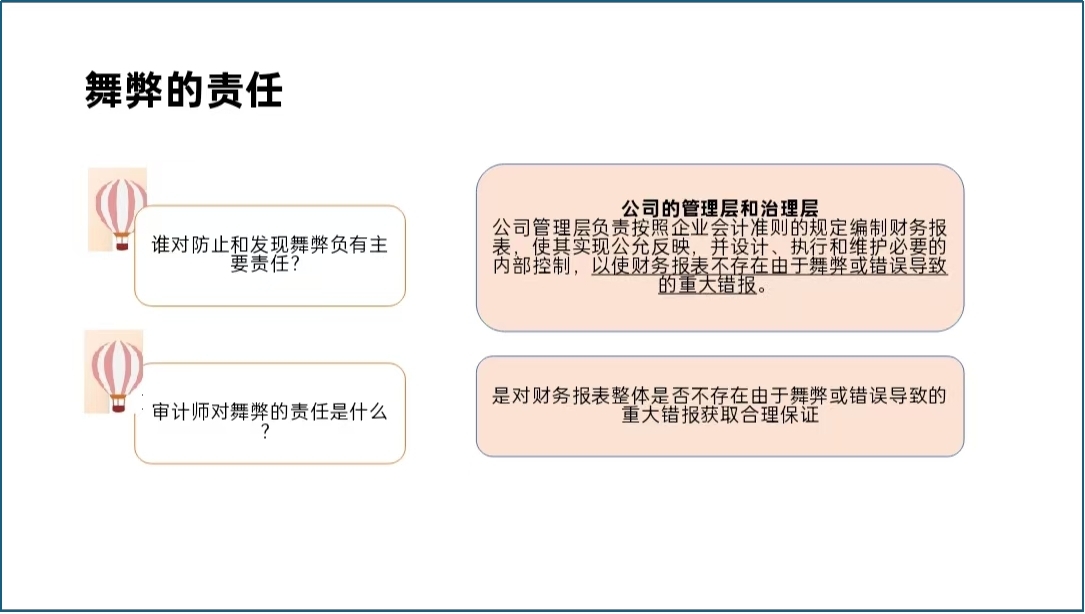 接下来,郭素宏女士引用《中国注册会计师审计准则第1141号——财务报表审计中与舞弊相关的责任》(2022年12月22日修订)的第4条对舞弊的概念定义,并进行解释,也阐释了舞弊的违法性,要求同学们守好法律红线,杜绝舞弊。