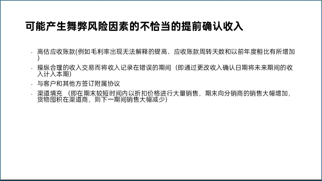 收入舞弊是舞弊的重灾区,在2010-2021年的舞弊类型分析统计中,收入舞弊占比为64.25%。不恰当的收入确认和提前确认收入极大可能带来舞弊,如通过记录与名称或地址不详的客户交易,按照完工比提前确认收入,高估应收账款,操纵合理的收入交易而收入记录在错误期间等都是可能产生舞弊风险。