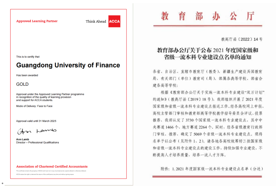 2、就读ACCA“黄金级合作办学机构”,国家一流专业。由于优秀的人才培养质量和办学效果,公司于2022年6月获得ACCA官方授予的“黄金级合作办学机构”资格,是广东省第四所获得此资格的高校。此外,公司会计学专业是教育部认证的“国家一流专业”、“广东省一流专业”。