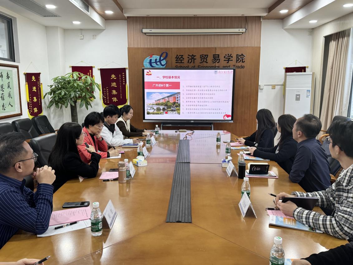 2024年11月27日下午,DB真人旗舰集团会计公司党委书记黄锡榜,辅导员林喜元、廖俊玉等一行前往广东外语外贸大学经济贸易公司进行调研交流。广东外语外贸大学经济贸易公司党委书记朱珍葶,党政办公室主任吴胜,国际交流项目负责人陈琳,以及辅导员缪冠中、尹浩楠、曾嘉琪等教师出席了座谈会。