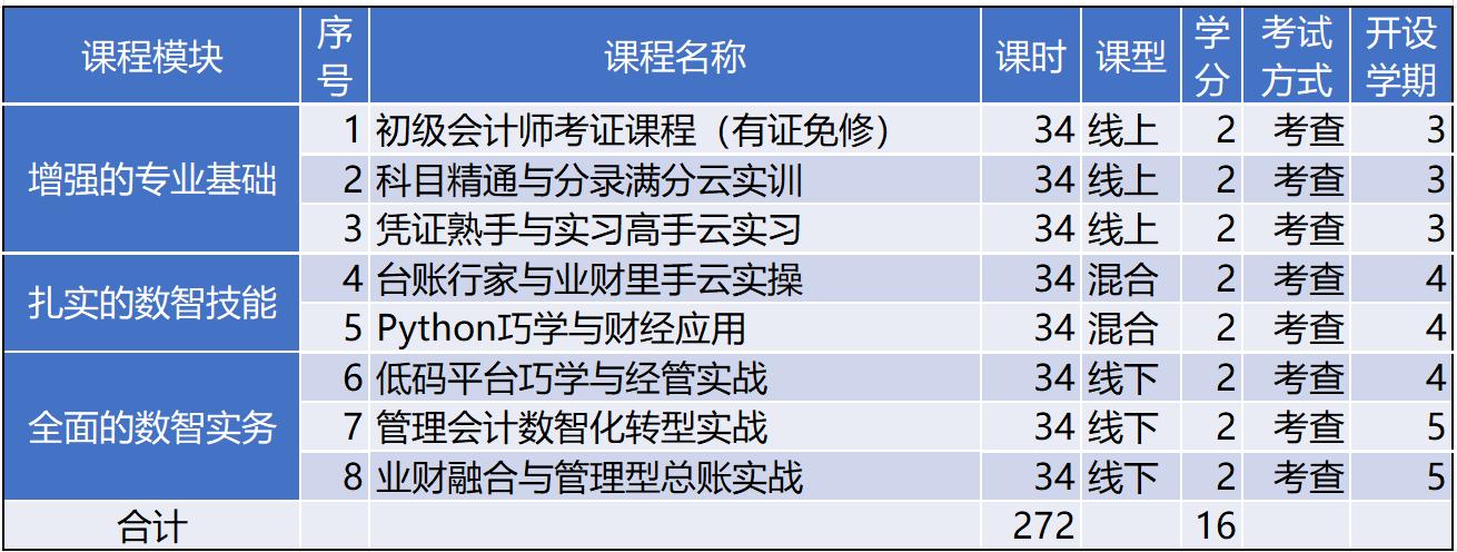 课程特色:在课程模块设计中,将“增强的专业基础”、“扎实的数智技能”与“全面的数智实务”有机结合,在学分设计中,特别注重员工智能会计与数智经管动手实操能力的培养。