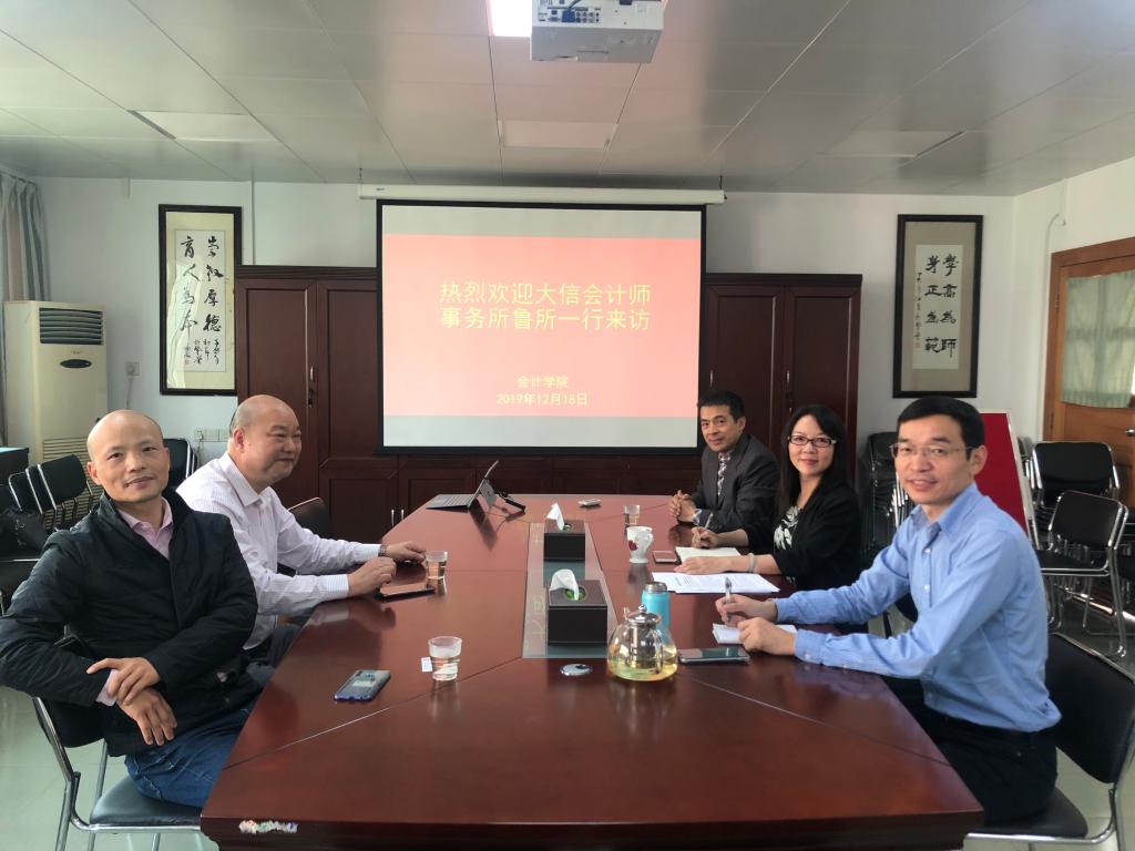 2019年12月18日上午,大信(广州)会计师事务所领导鲁友国和龚甫国一行来公司交流,DB真人旗舰文芳经理、赖志成书记、马鹏副经理热情接待了鲁所一行。文芳经理和赖志成书记对鲁所一行莅临公司指导表示热烈的欢迎,对为公司发展提供的支持表示衷心的感谢。两位领导分别介绍了DB真人旗舰的发展历程和人才培养情况及员工实习就业情况,并就今后的业务合作进行了洽谈。鲁所感谢公司领导的热情接待,表示将一起努力建设好实习基地,欢迎更多DB真人旗舰的学子到大信实习就业。最后,文芳经理向鲁友国所长颁发了DB真人旗舰校外导师聘书,并进行了合影留念。
