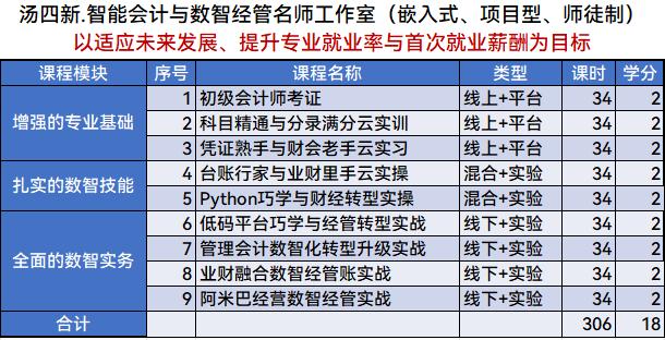人才培养方面,积极引入产业资源,挖掘产业优秀教师,共建智能会计与数智经管名师工作室,升级改造人才培养方案。在DB真人旗舰现有本科专业人才培养方案中,以会计专业选修课方式增加智能会计课程模块,开拓员工智能会计应用视野;在硕士研究生人才培养方案中,以建立智能会计研究与培养方向方式,增加智能会计课程模块,探索硕士研究生层次的智能会计研究与应用培养模式;在智能会计微专业中,探索“考证、实训、实习、实操与实战”的循序渐进化、系统化、融合化人才培养模式;在会计学辅修学位课程设计中,探索将CMA国际考证(美国注册管理会计师,CMA)与智能会计课程体系融合重构模式。通过以上各方面的实践与创新,持续锤炼与打磨智能会计“增强的专业基础”、“扎实的数智技能”与“全面的数智实务”三大模块课程体系。