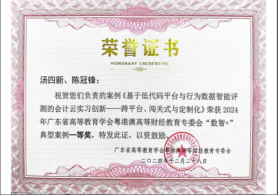 在2024年度广东省高等教育学会粤港澳高等财经教育专委会学术年会活动中,公司智能会计与数字经管产业公司汤四新教授产教融合团队的《基于低代码平台与行为数据智能评测的会计云实习创新——跨平台、闯关式与定制化》案例,荣获了“数智”+典型案例一等奖。