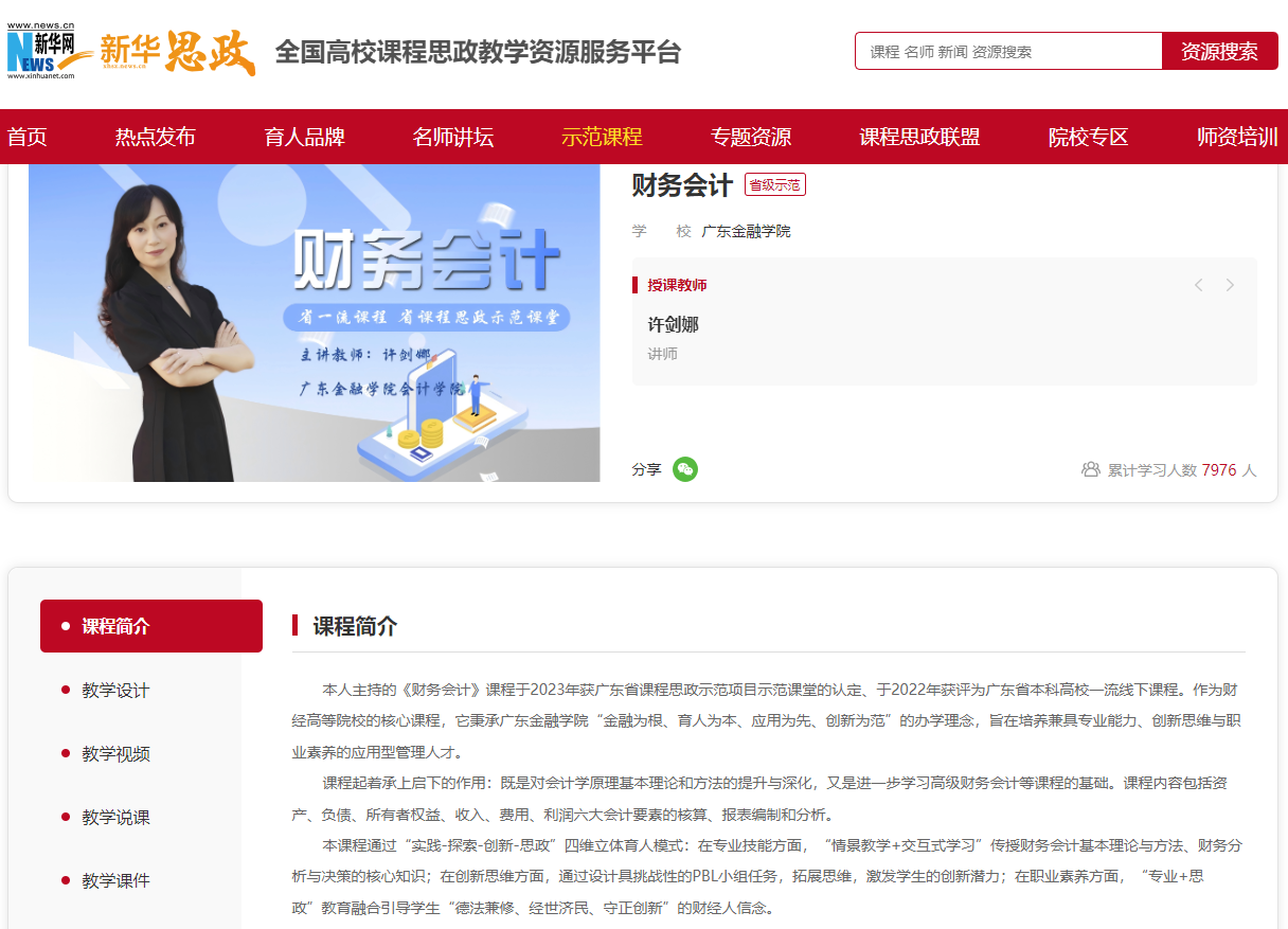 喜报:公司许剑娜老师主讲的《财务会计》课程入选新华网新华思政“省级示范”板块